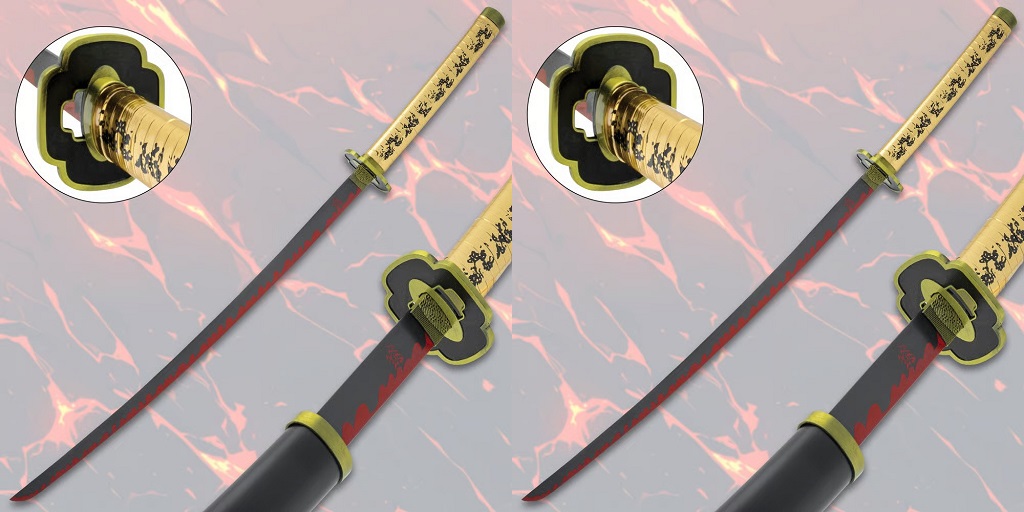 Its crossguard is circular, its handle is wrapped in yellowed cloth rather than gold, and its sheath is white rather than black. These details cast doubt on whether the sword is truly Yoriichi’s original.