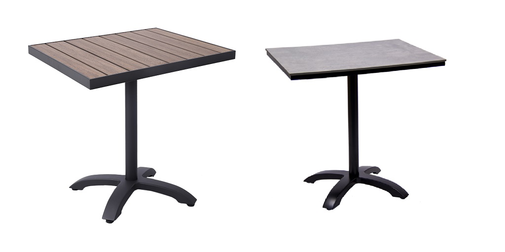 Imitation teak slat tables offer the beauty of natural wood without maintenance. Business owners seeking a premium patio aesthetic can count on these tables to impress, minus the constant upkeep worries.
