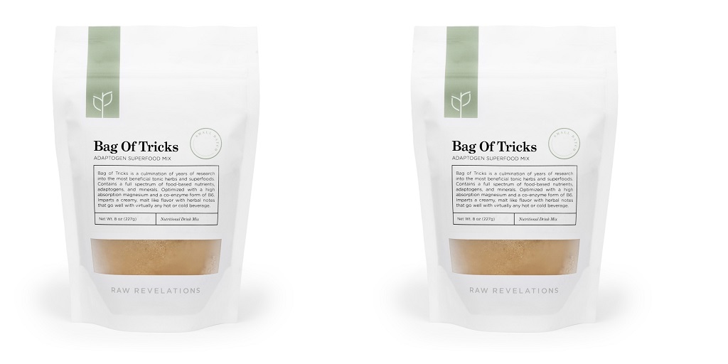 A great example of a high-quality adaptogen powder is the Bag of Tricks by Raw Revelations, which combines some of the most potent adaptogens into one easy-to-use product.